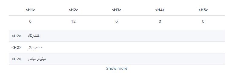 - با برسی تگ های بسیار با ارزشی Heading مشخص شد که از تگ H1 اصلا استفاده نشده است. تگ H1 بر دریافت رنک بالا در صفحه نتایج جستجو گوگل بسیار با اهمیت است. در این سایت تنها تگ H2 آن هم به تعداد ۱۲ مرتبه مشاهده می شود.
