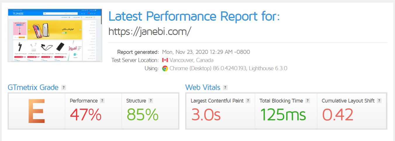 - سرعت بارگیری صفحات بر اساس تست GTmetrix زمان ۳٫۰ را نمایش می دهد. گرید کلی آن در نزد گوگل در حالت E قرار دارد که واقعا می توان آن را بهینه تر نمود. با فشرده سازی تصاویر و تبلیغات کمتر