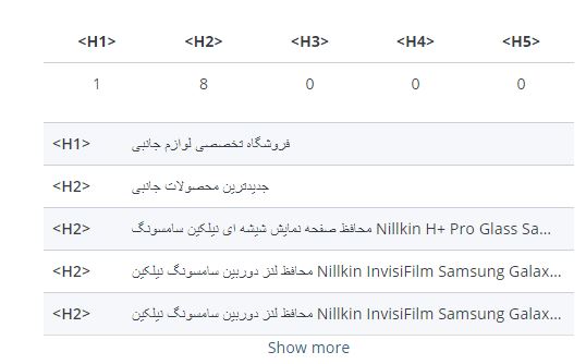 - در بررسی سورس سایت فروشگاه اینترنتی لوازم جانبی، تگ با اهمیت H1 برای نوشتن عنوان وب سایت استفاده شده است. از تگ H2 نیز به تعداد ۸ بار استفاده شده است. در خصوص تگ های Heading باید عرض کنیم که در نزد گوگل استفاده از آنها یک امتیاز به حساب می آید.