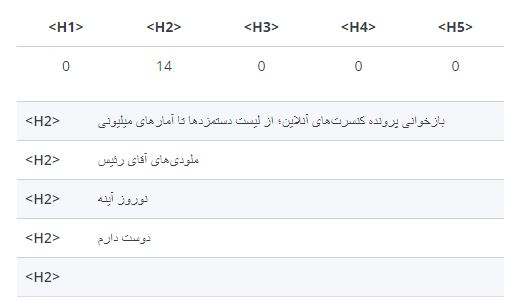 - در تحلیل و آنالیز سئو این سایت در قسمت تگ های عناوین (Heading) مشخص گردید که فاقد تگ ارزشی H1 است. اما تگ H2 تعداد ۱۴ بار استفاده شده است. در توضیح و اهمیت استفاده از تگ های هدینگ باید گفت که مانند شناسنامه برای هر بخش از محتوای شما می باشند و در نزد گوگل به کار بردنشان بسیار اهمیت دارد و با ارزش می باشد.