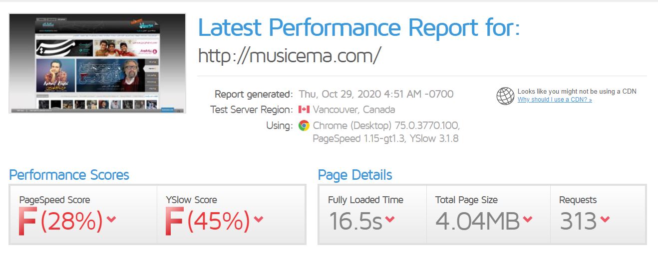 - با بررسی و تحلیل سرعت لود شدن سایت در تست تست GTmetrix زمان ۱۶٫۵ ثانیه را نمایش می دهد و در گرید F یعنی ۲۸% قرار دارد که رتبه خوبی نمی باشد و امکان بهینه نمودن آن وجود دارد. بهینه سازی را می توان با فشرده سازی تصاویر و کم نمودن بنرهای تبلیغاتی و همچنین استفاده از سیستم AMP برای فشرده کردن کد سورس ها استفاده نمود.