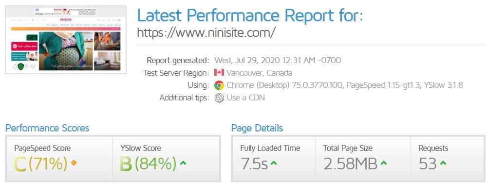 - سرعت لود صفحات در این سایت، طبق تست صورت گرفته ۷٫۵ ثانیه است که در گرید C قرار دارد. امکان بهینه سازی بالا بردن سرعت آن وجود دارد. این کار را می توان با استفاده کمتر از تصاویر، فشرده سازی آنها و همچنین استفاده کمتر از بنر های تبلیغاتی انجام داد.