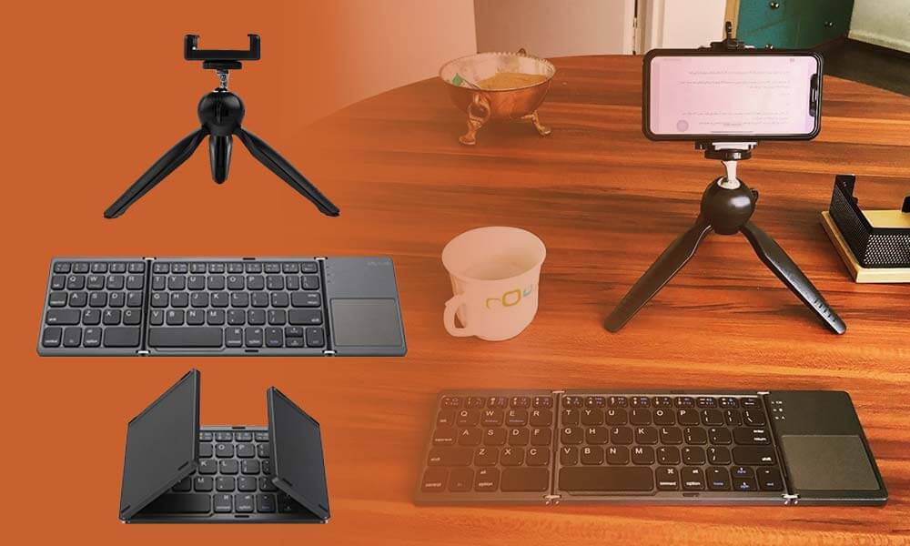 خب همانطور که در تصویر می بینید می توانید با یک سه پایه موبایل رومیزی و یک صفحه کلید تاشو بلوتوثی و نرم افزار ورد در اندروید توانایی نوشتن و صفحه آرایی یک کتاب الکترونیکی را با گوشی خود دارید. نرم افزار تولید محتوا متنی در موبایل همان مجموعه آفیس اندروید است که می توانید به راحتی با یک جستجو ساده در گوگل به این نرم افزارها دسترسی داشته باشید.