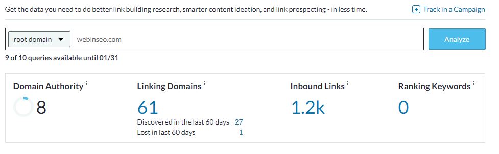 بعد از آن سایت ماز به بررسی می پردازد و نتیجه به صورت تصویر زیر به شما نمایش داده می شود. و شما می بینید که سایت webinseo.com از چه قدرت دامنه ای برخوردار است.